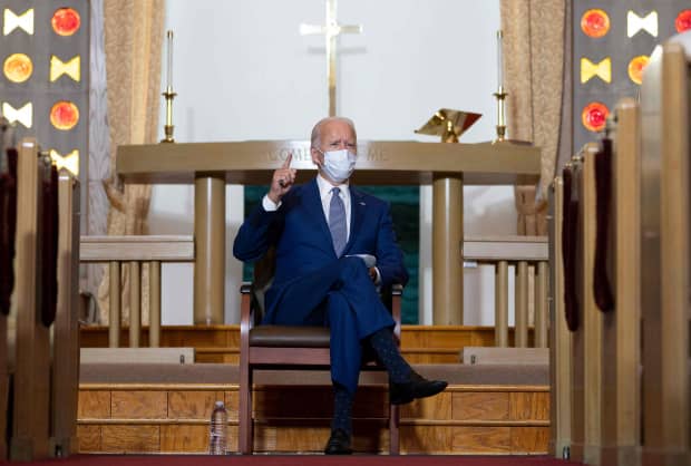Democratic presidential candidate and former US Vice President Joe Biden speaks at Grace Lutheran Church in Kenosha, Wisconsin.