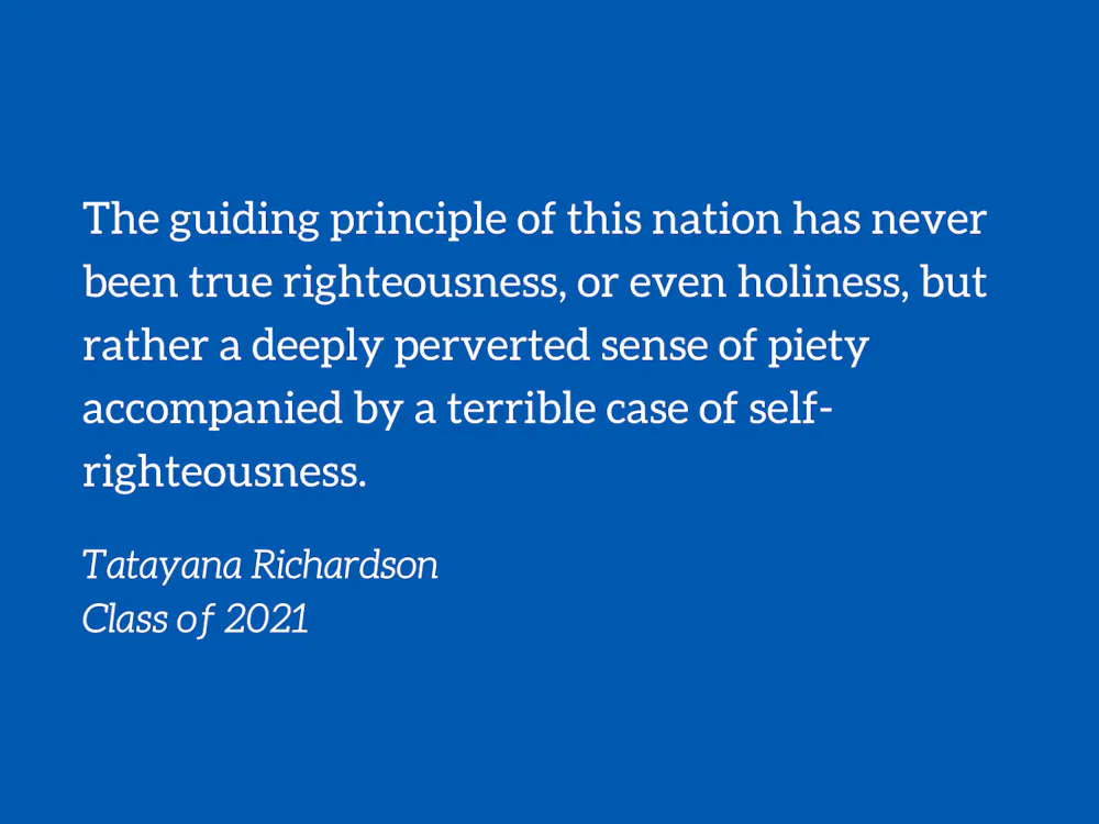 America’s legacy is to believe it is always acting in a righteous manner. From its inception through to the present day, the United States of America continues to believe that divine ordination supports its oppression of marginalized bodies. In reality, the guiding principle of this nation has never been true righteousness, or even holiness, but rather a deeply perverted sense of piety accompanied by a terrible case of self-righteousness.